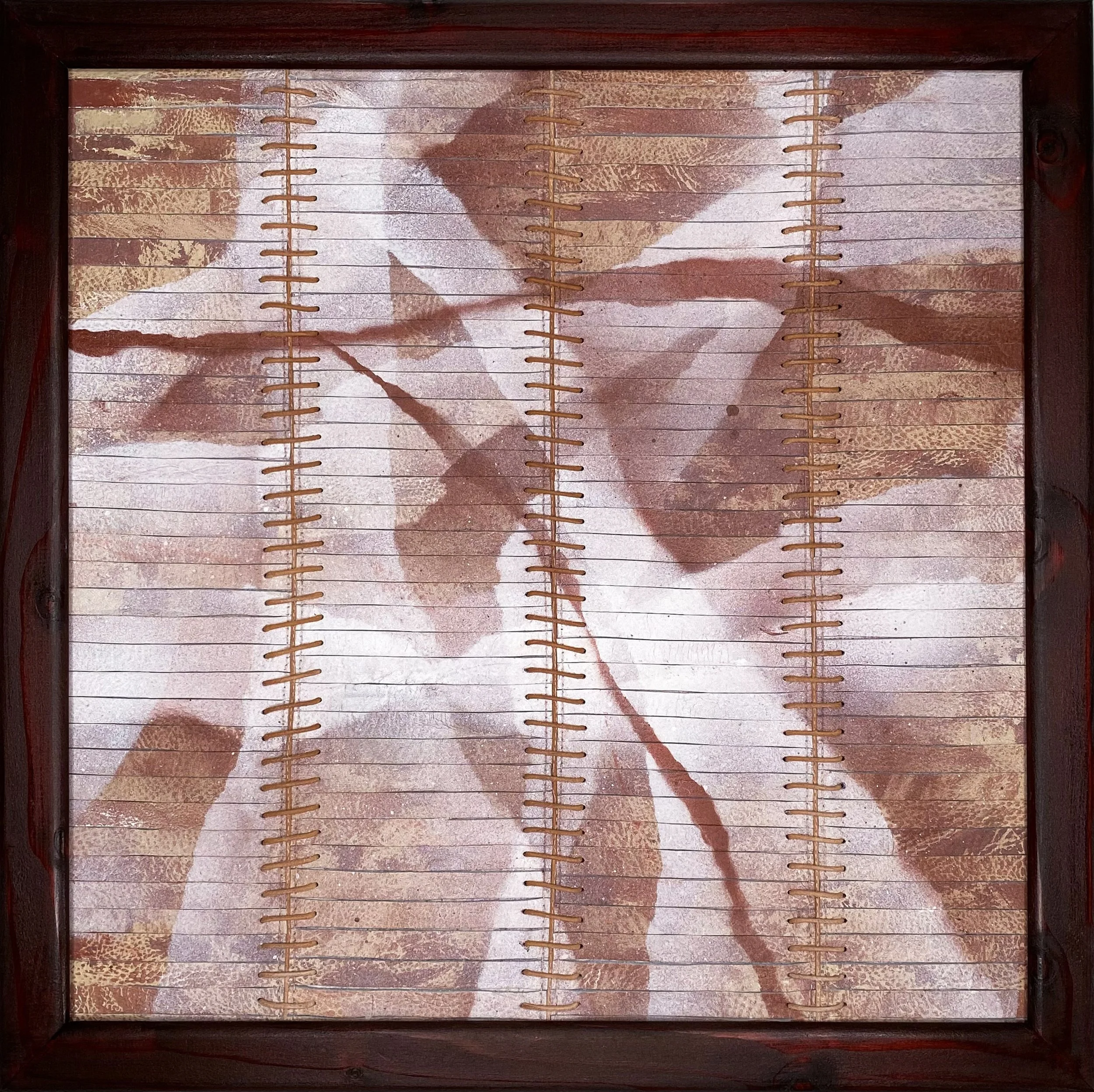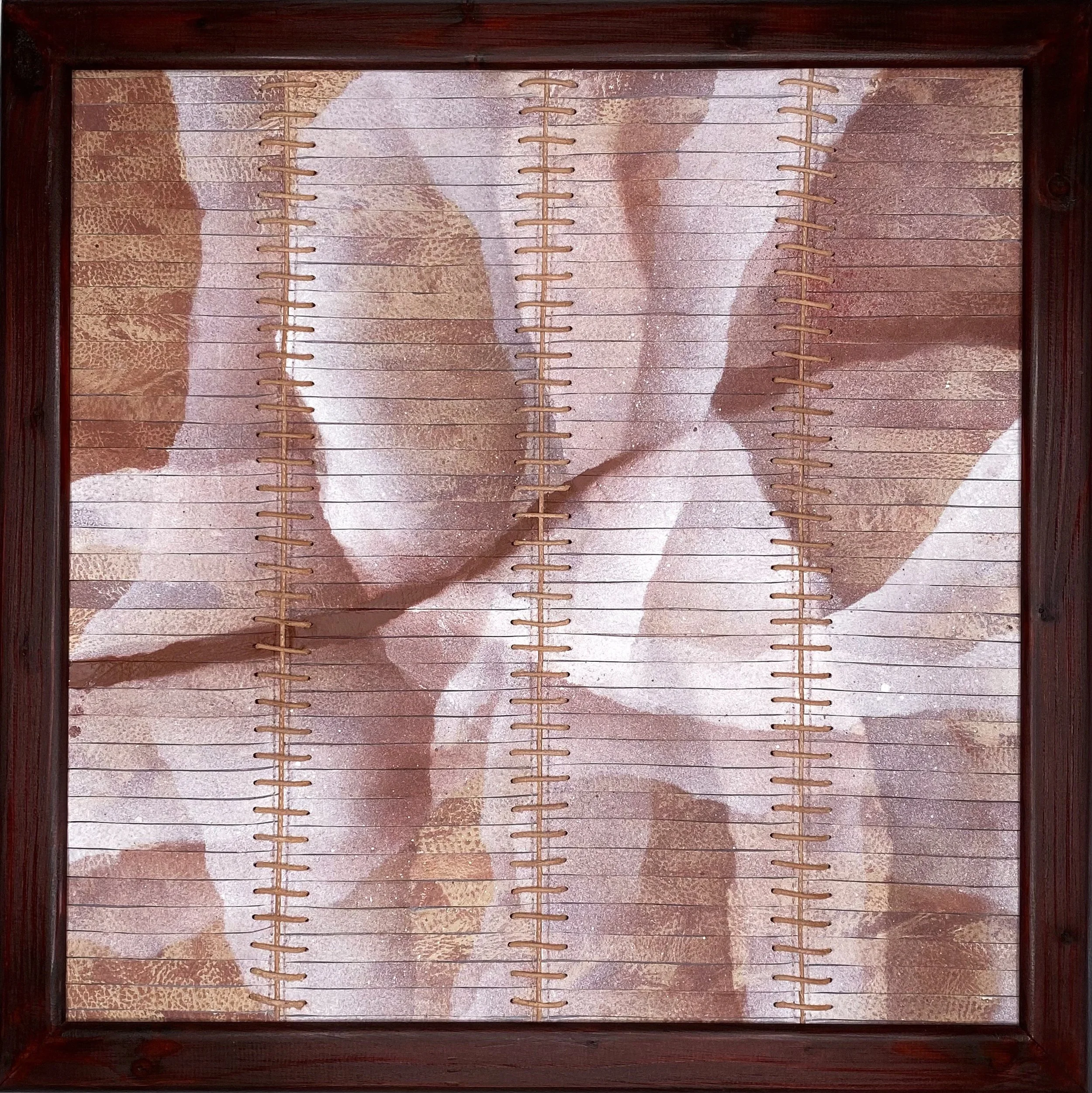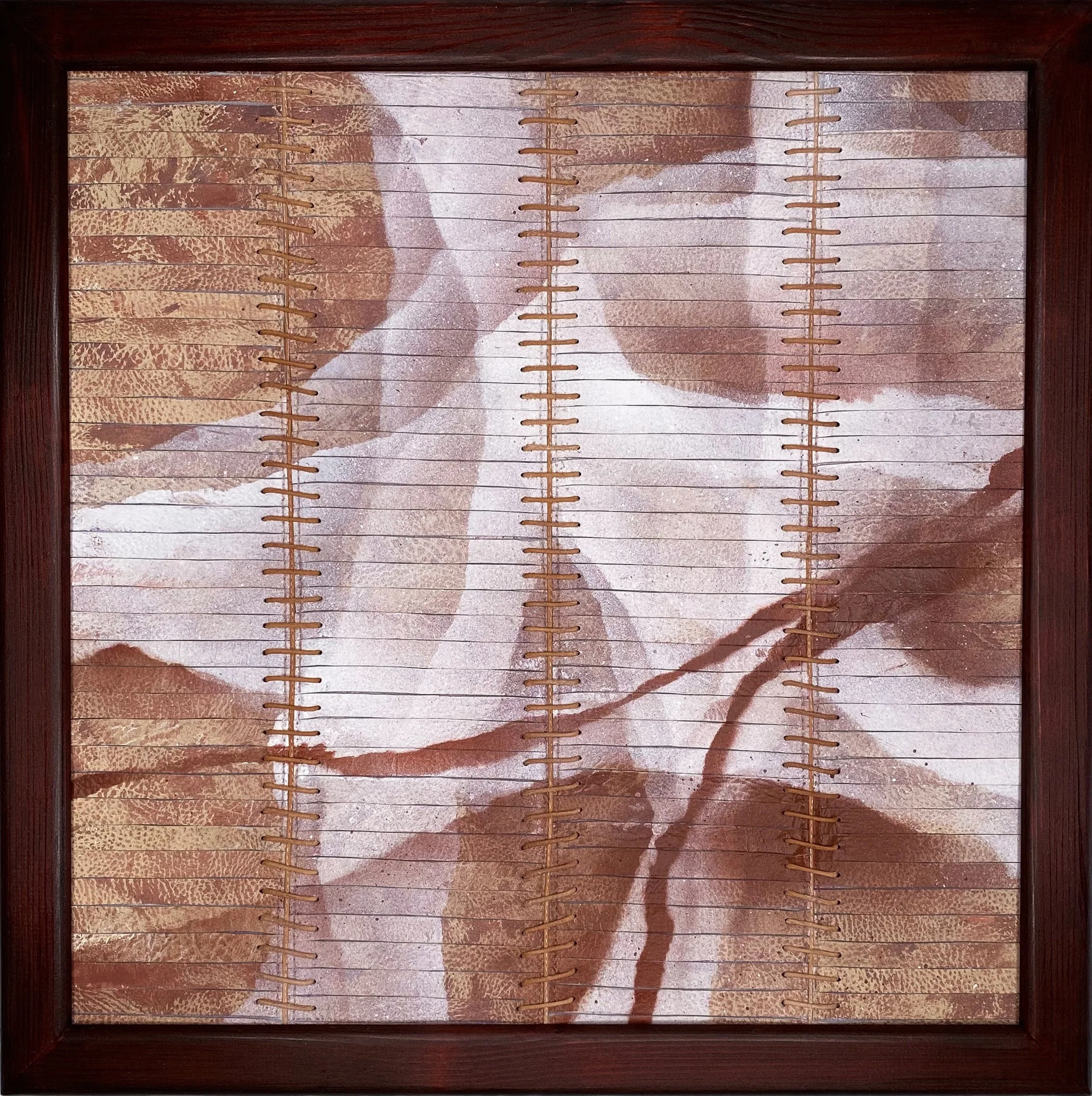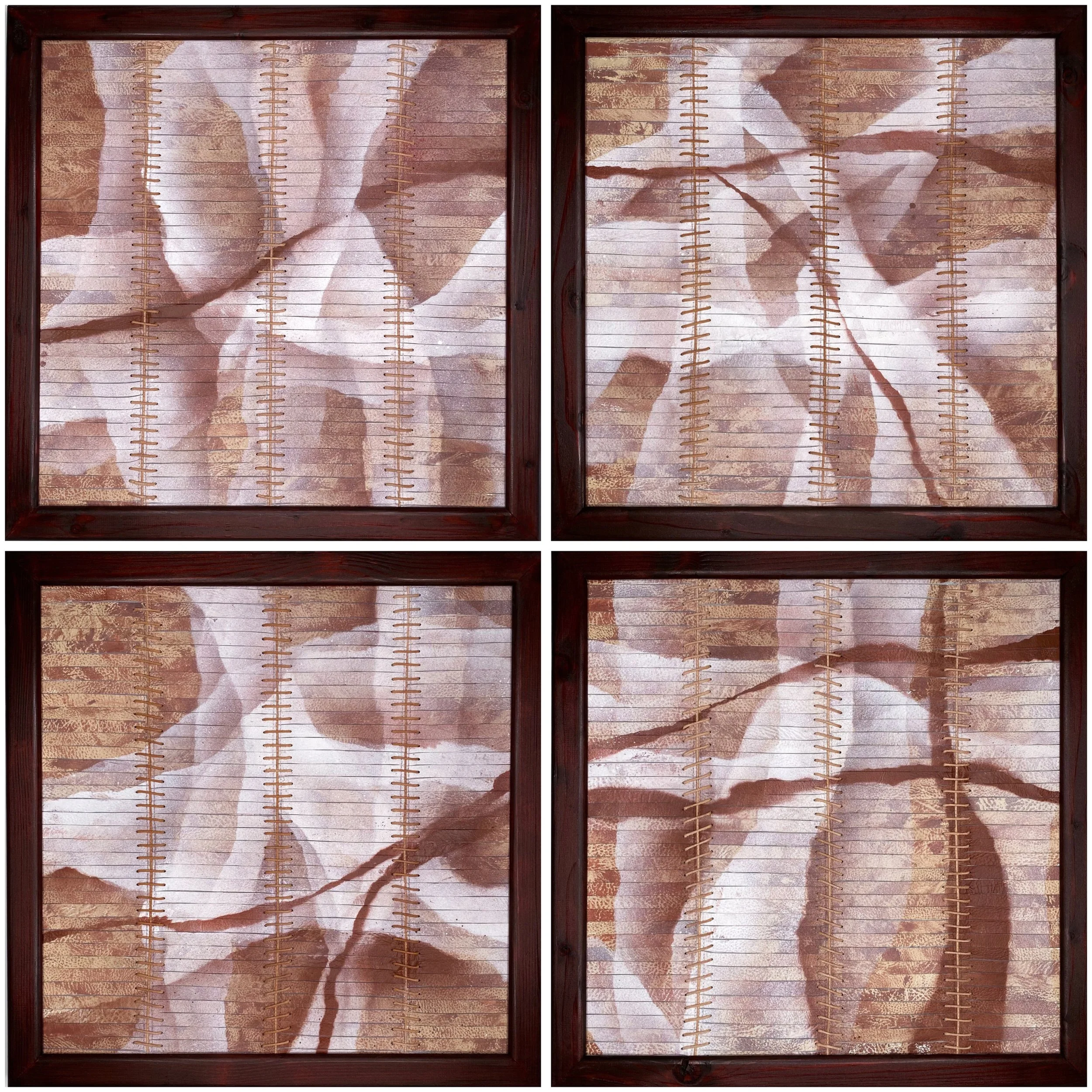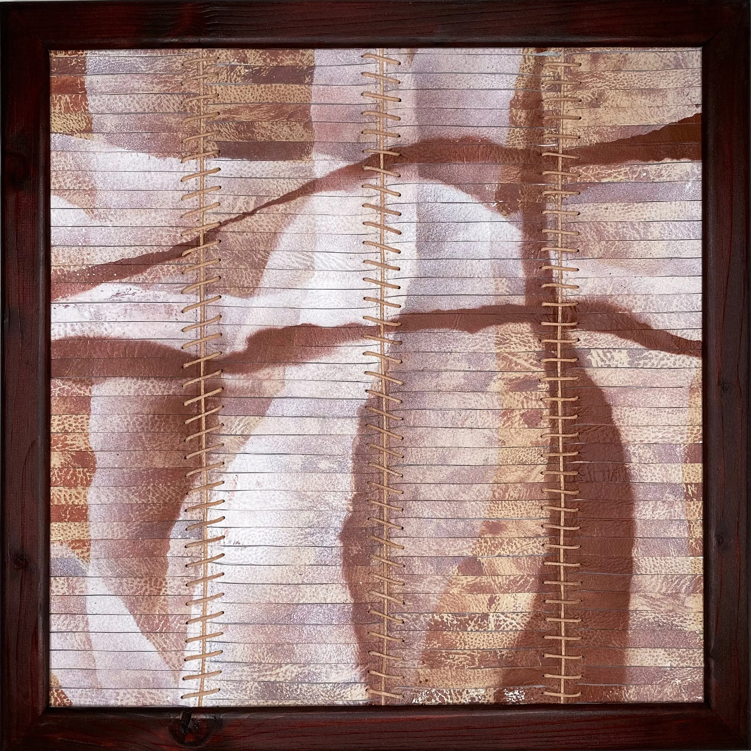 The painting "Mahogani Soul" consists of four art pieces and serves as a metaphor for something or someone possessing a soul that mirrors the qualities of mahogany. The warm, earthy tones of mahogany symbolize stability, inner strength, and elegance, while the leather remnants, hand-painted and intricately cut, convey an essence of rebirth, sustainability, tradition, and resilience.